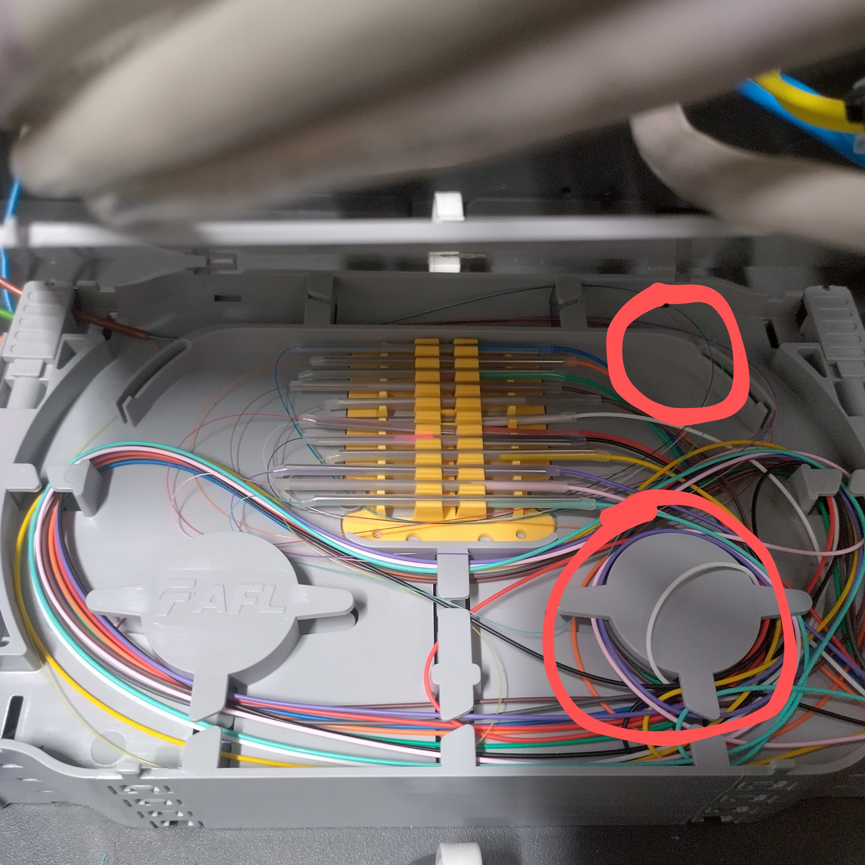 - Secure the splices in their holders and then repeat step 3 and 4 for the next tube, keeping the pigtails out of the way.