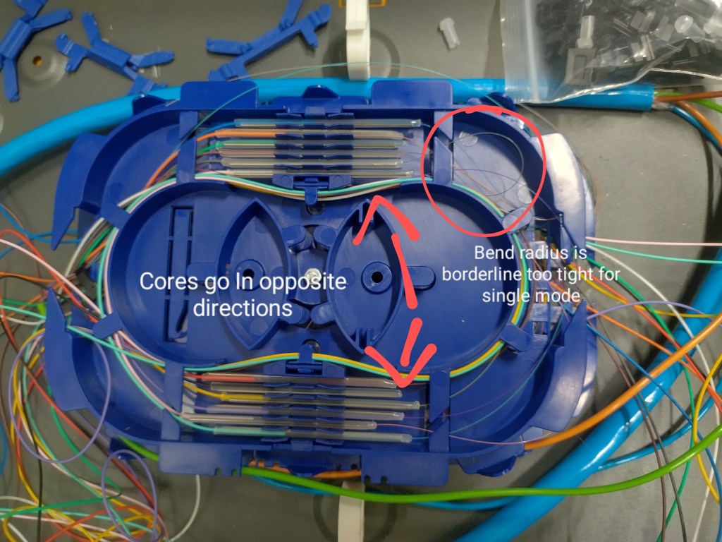 A bend like that above will likely fail a test from an OTDR. Keeping cores in one direction is a matter of preference, however I find it easier to keep my cores neat and avoid silly bends if I keep them going in the same direction. Ensure that one set of cores is kept longer than the other so that it will reach the opposite slots. After stripping off the tube, measure out the length of the fiber cores using the splice tray, if the tray is setup like the one above and half your splices will have to be placed on two opposite sides of the tray then cut one set of cores half a tray length longer or shorter to account for this prior to splicing.